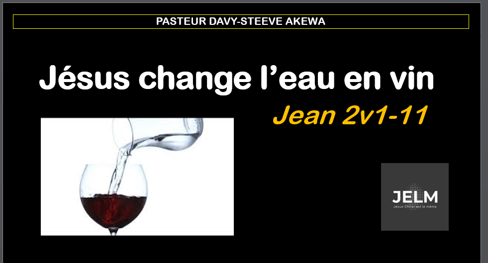 Il s'agit du premier miracle de Jésus, il change l'eau en vin et manifeste sa gloire.